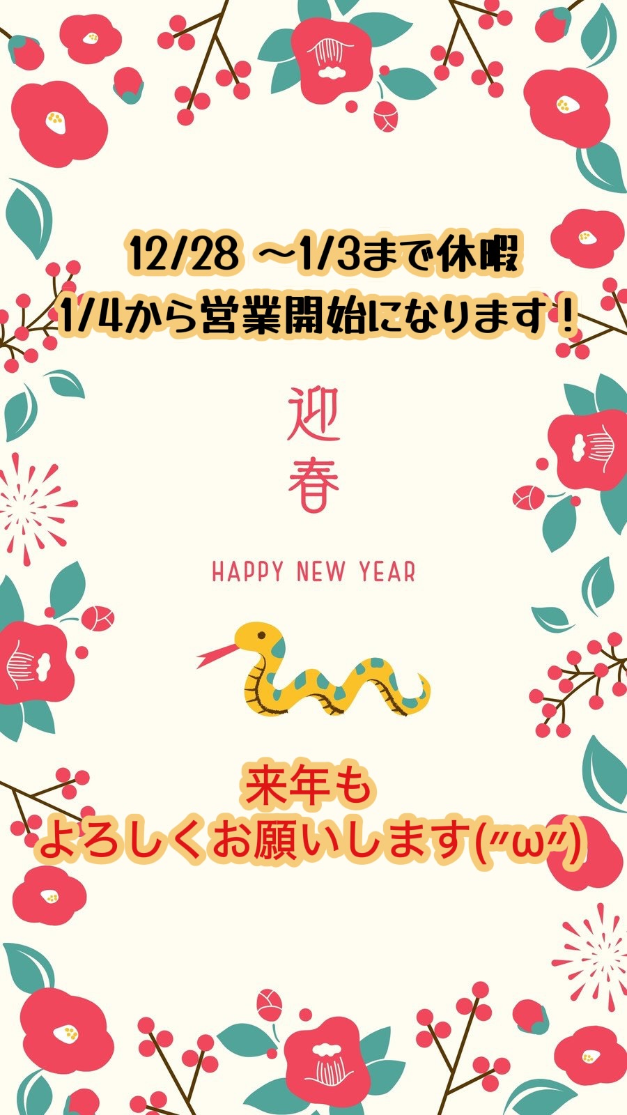 12/28 ~1/3まで休業になります!
